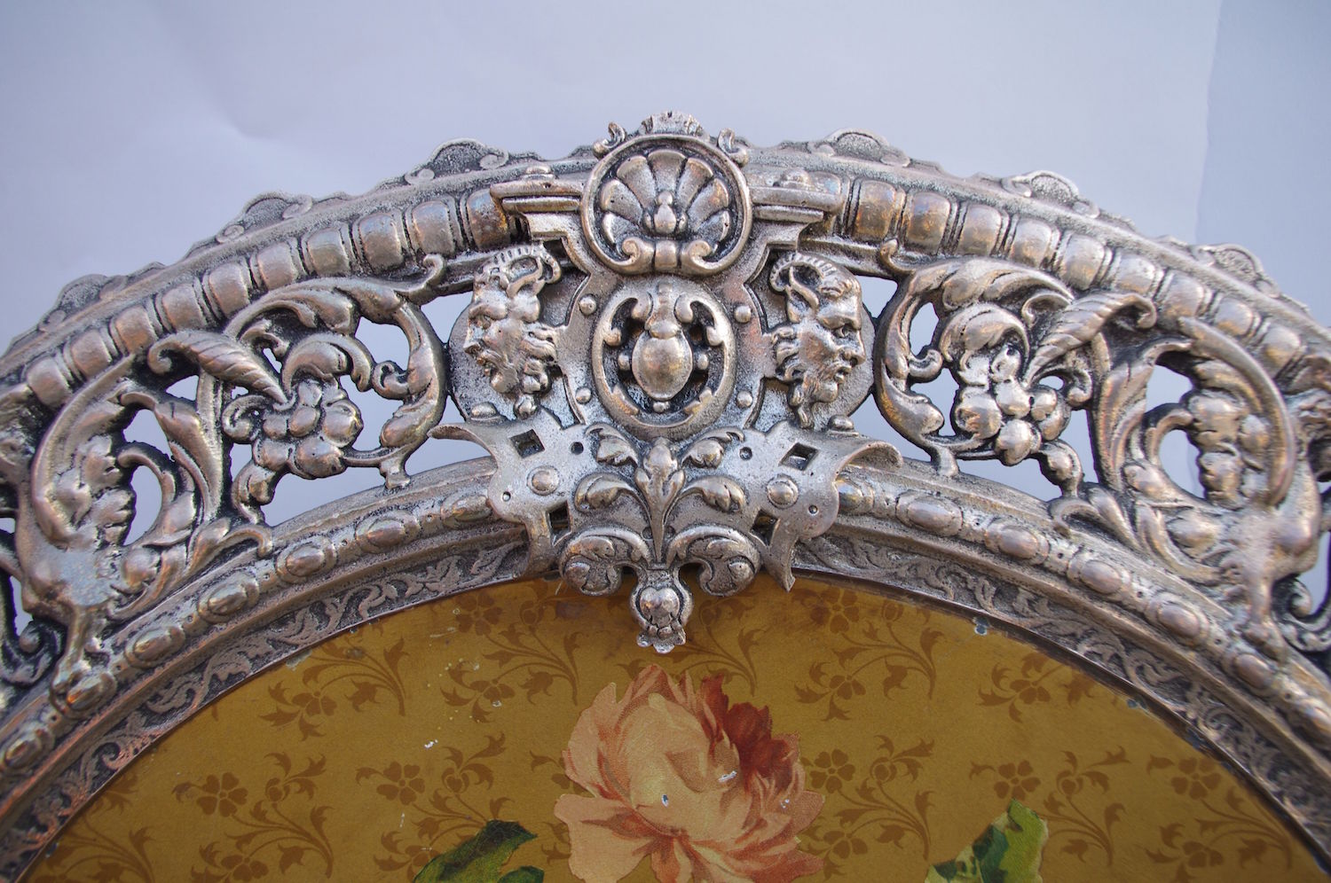 Large ornamental plate composed of a round picture in enamelled iron representing birds in a rose tre framed by an openwork wrought iron with interlacing decoration of plants and a gadroon frieze.