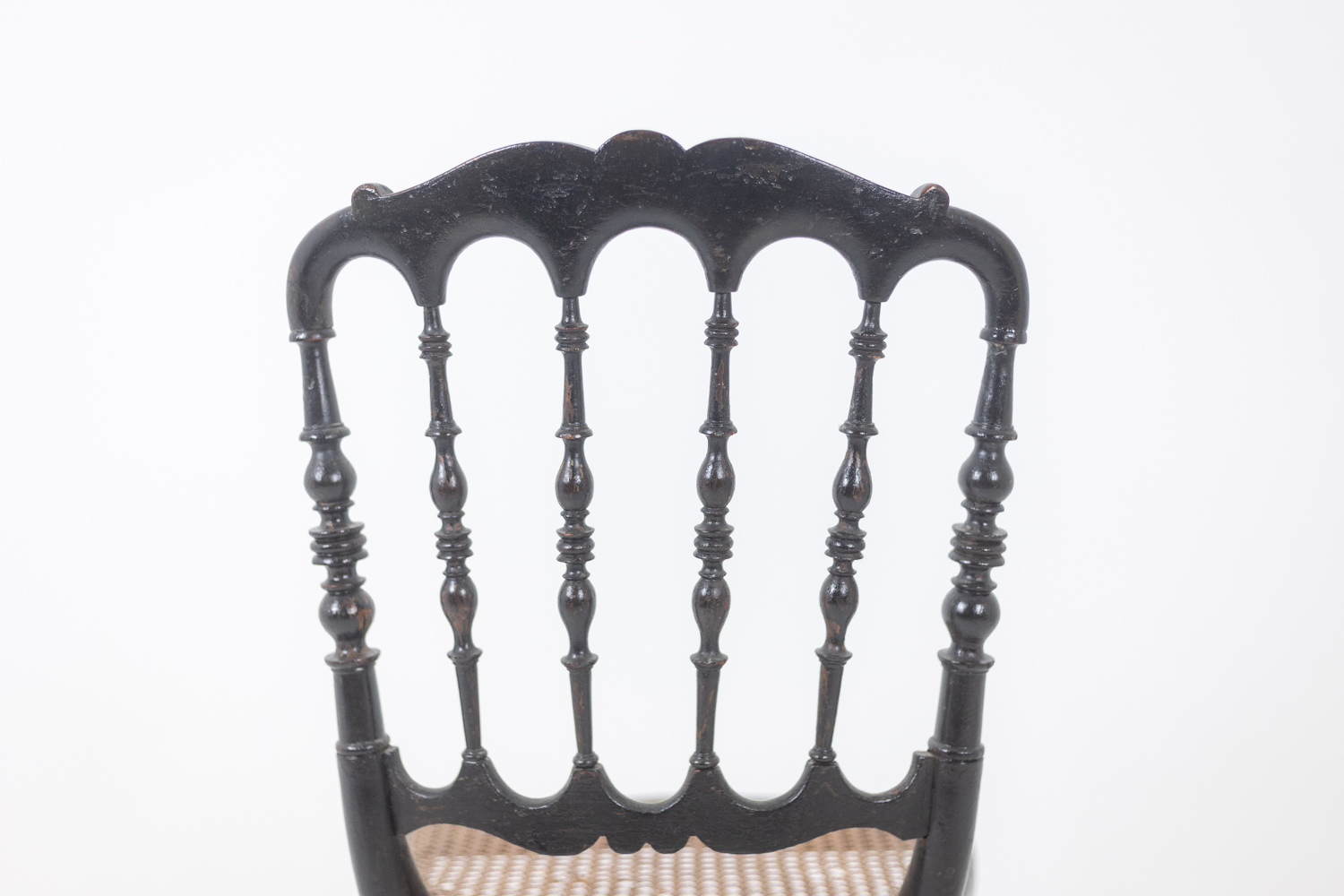 Chair in turned and blackened wood, the back with columns and the front legs as well as the spacer decorated with golden branches. Cane seat. French work from the Napoleon III period.