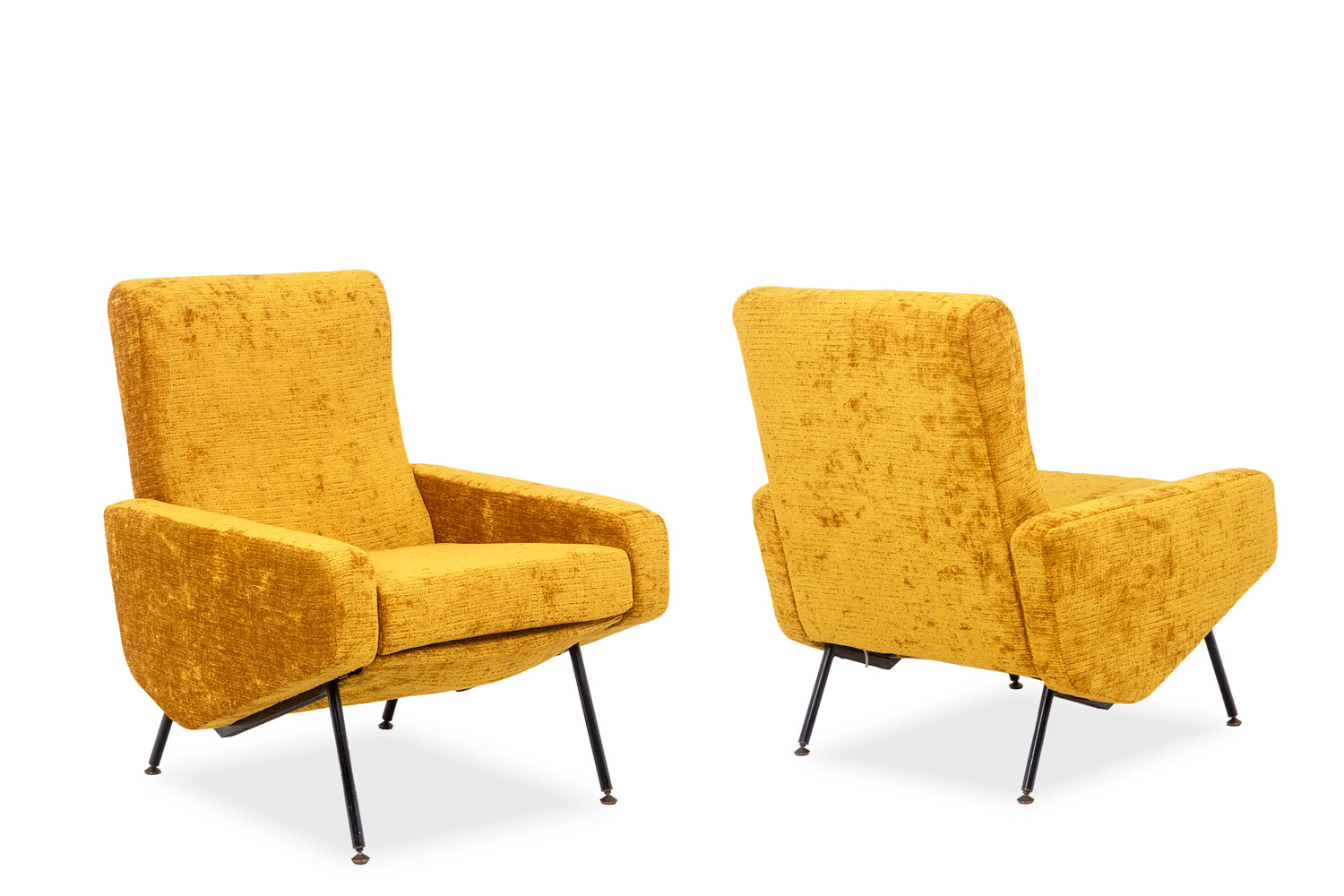 Pair of armchairs, “Troïka” model. Golden fabric and black lacquered metal base.