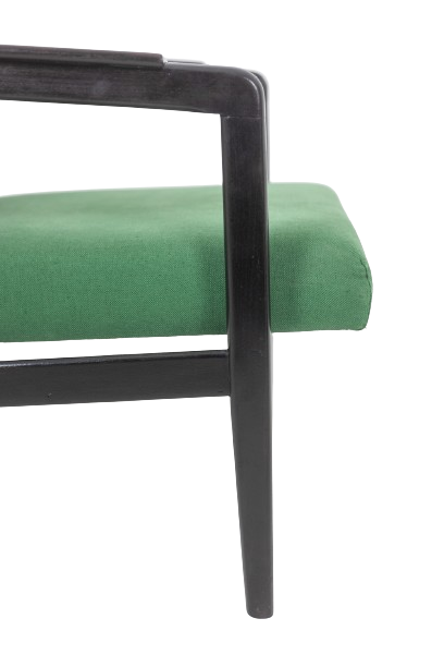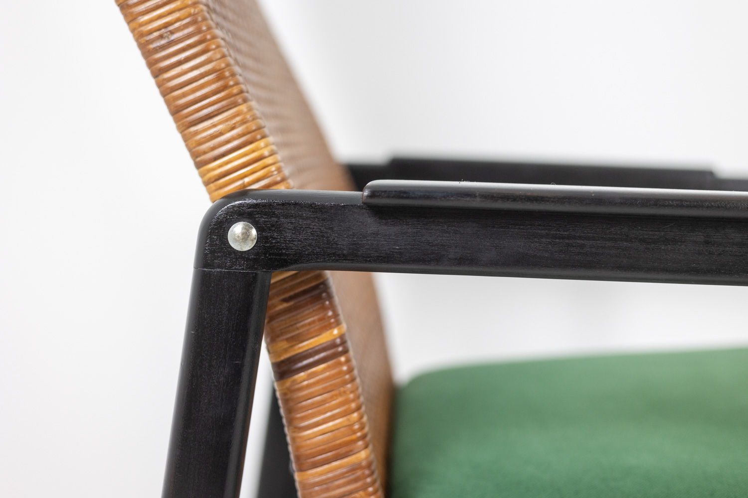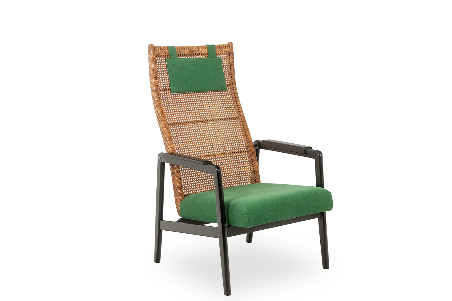 High-backed “lounge” armchair, in lacquered wood, leather and rattan.