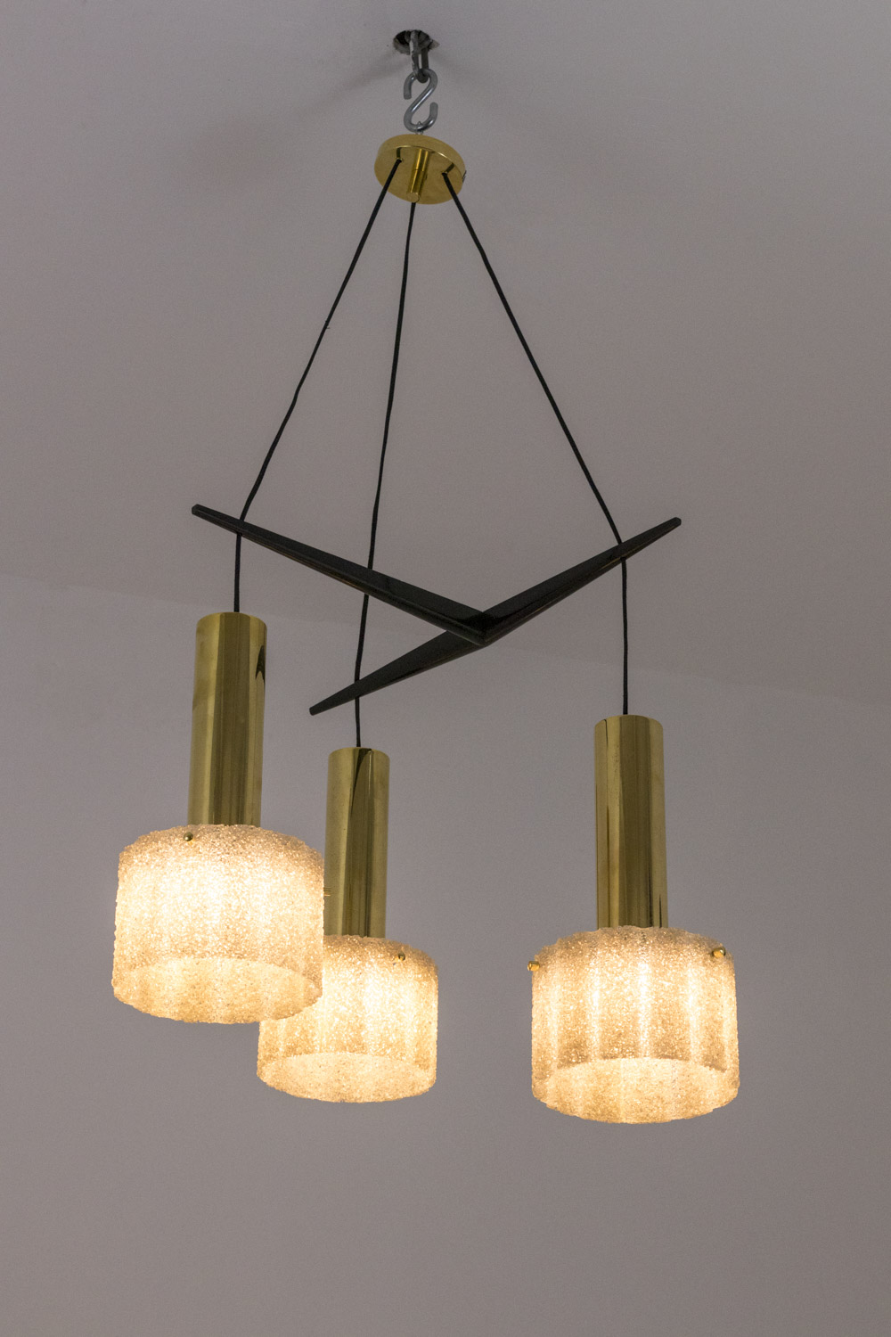 Chandelier in granite resin and gilt brass composed by three light mobiles hung thanks to wires to a geometrical black lacquered wood structure. Mobiles with cylindrical gilt brass shafts and cylindrical granite resin lampshades.