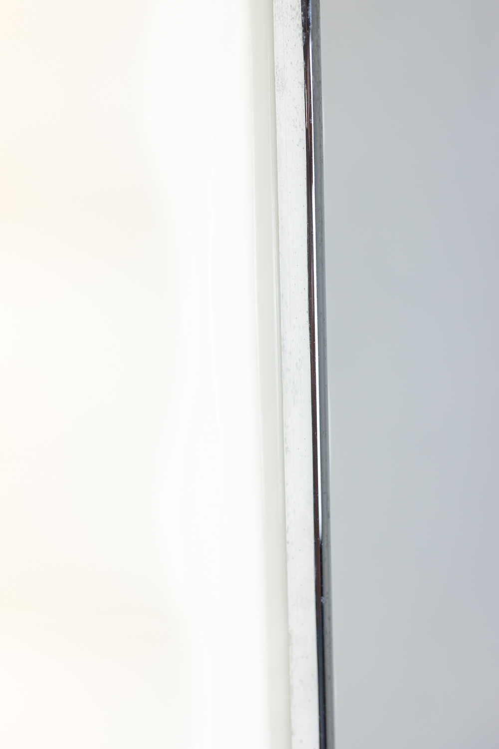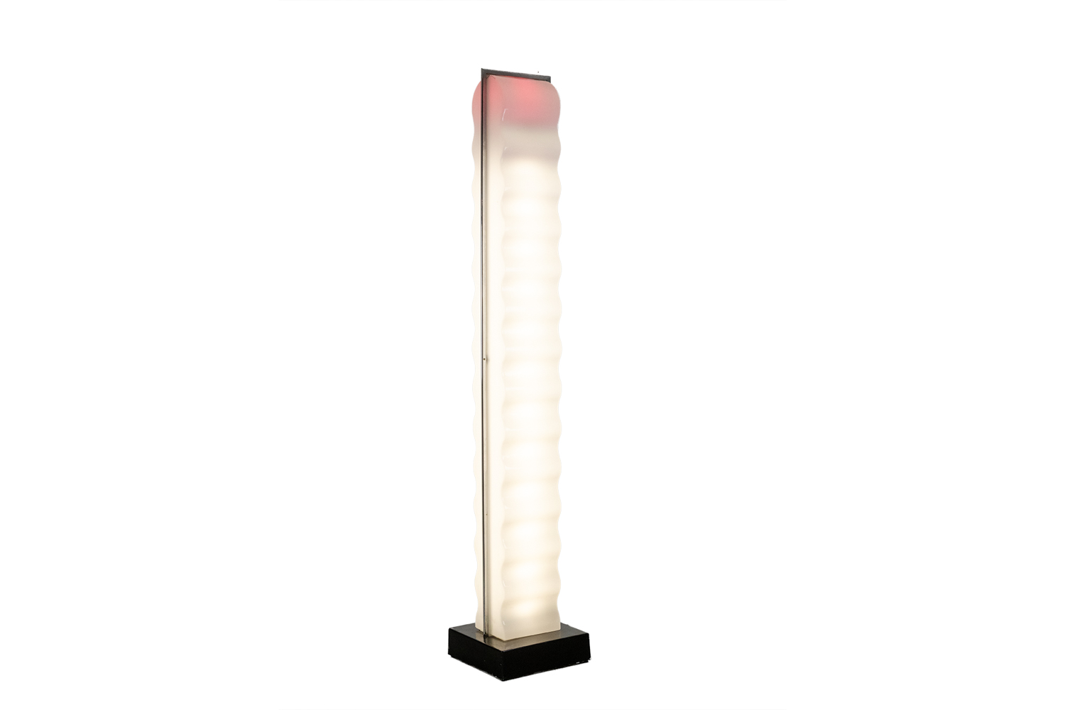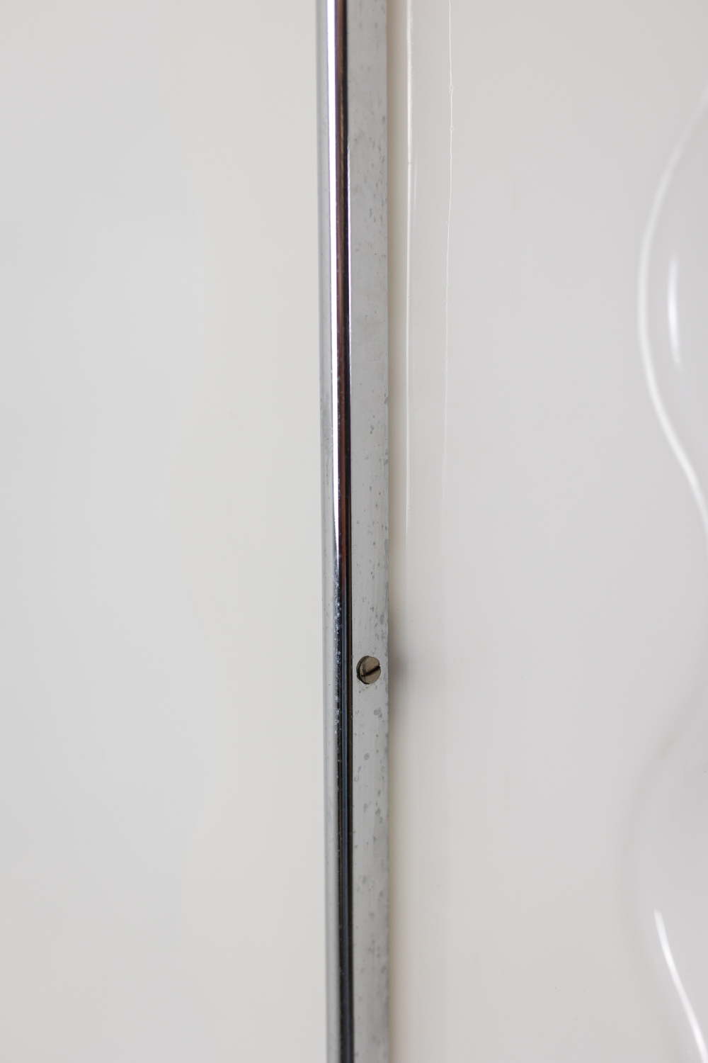 “Cometa” floor lamp, in white ABS and chrome-plated metal, with a black lacquered base.