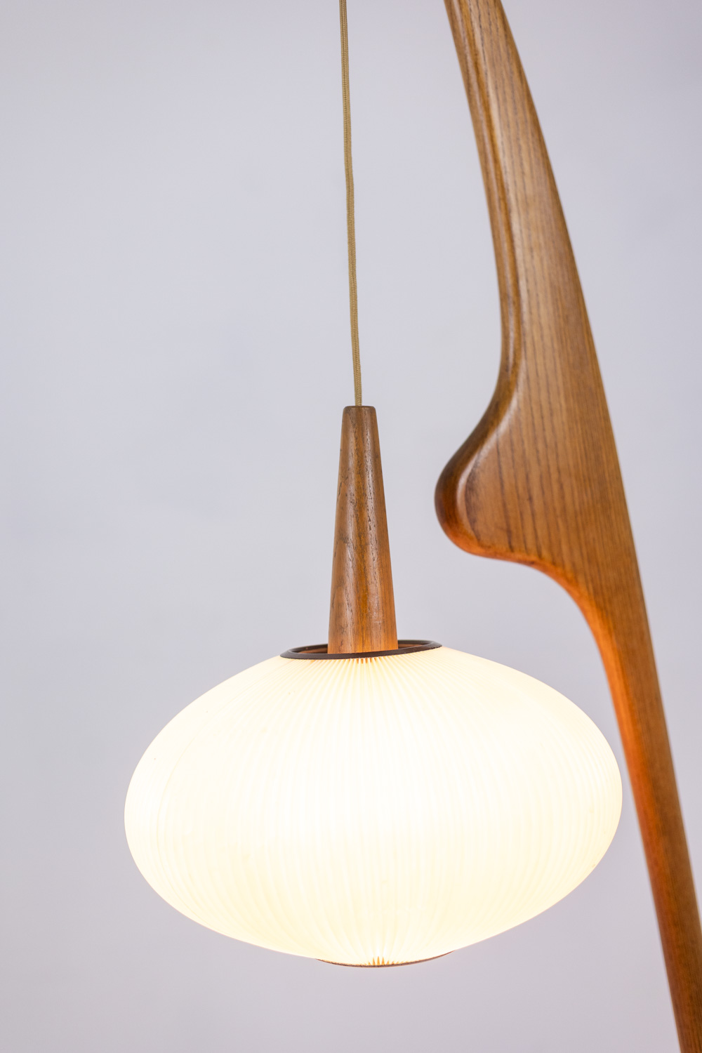 Floor lamp, “Praying Mantis” model, in blond elm and spherical shade in pleated rhodoïd.