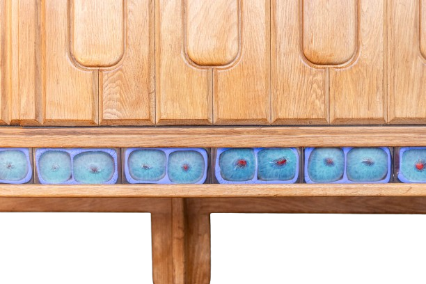 Enfilade en chêne blond massif ouvrant à deux panneaux coulissants sculptés et 4 petits tiroirs. Décor de carreaux de céramique, en frise en façade et sur le dessus de la partie tiroirs, travail probable du céramiste Boleslaw Danikowski L’enfilade repose sur 3 pieds de forme mouvementée.