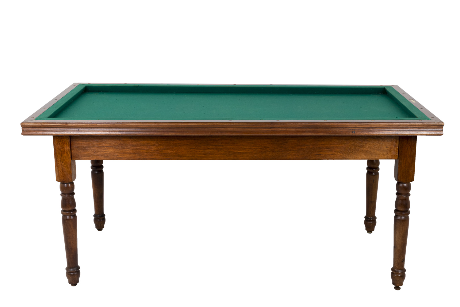Table de billard français de style Louis-Philippe en acajou reposant sur quatre pieds droits moulurés. Plateau de jeu en tissu vert amovible et réversible pour le transformer en table. Quatre queues et trois boules rangées sous le plateau.