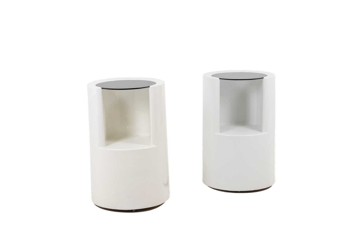 Paire de bouts de canapé ou chevets cylindriques de style Space Age, en fibre de verre laquée blanc et plateau de verre fumé (épaisseur du plateau 5 mm). Montés sur 3 petites roulettes.