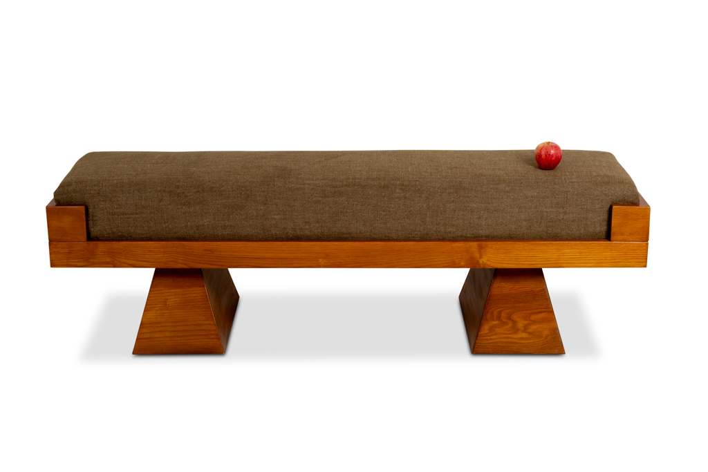 Banquette avec piètement en frêne et assise tapissée de velours de mohair vert (Elitis).