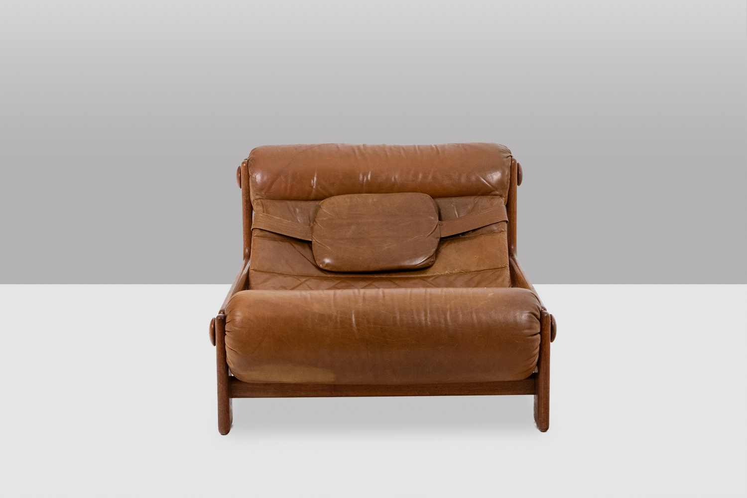 Fauteuil lounge et son ottoman, en orme blond et cuir.