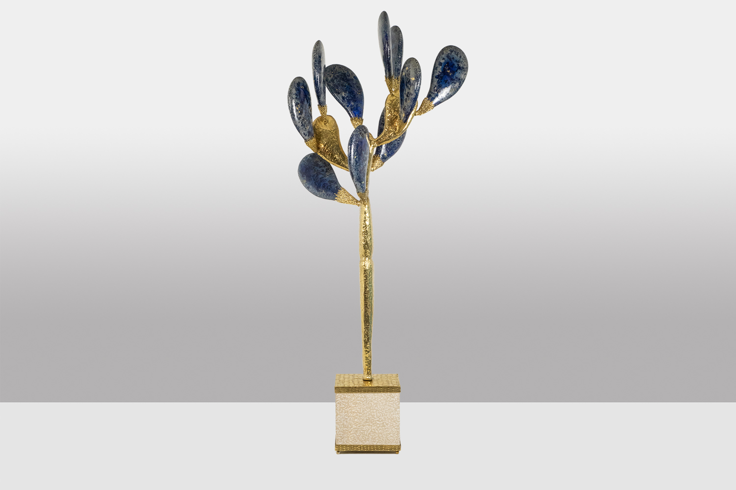 Grande sculpture cactus en laiton doré poli et martelé, laquée bleue à reflets or et argent à la façon du lapis-lazuli, reposant sur un socle en pierre de couleur crème.