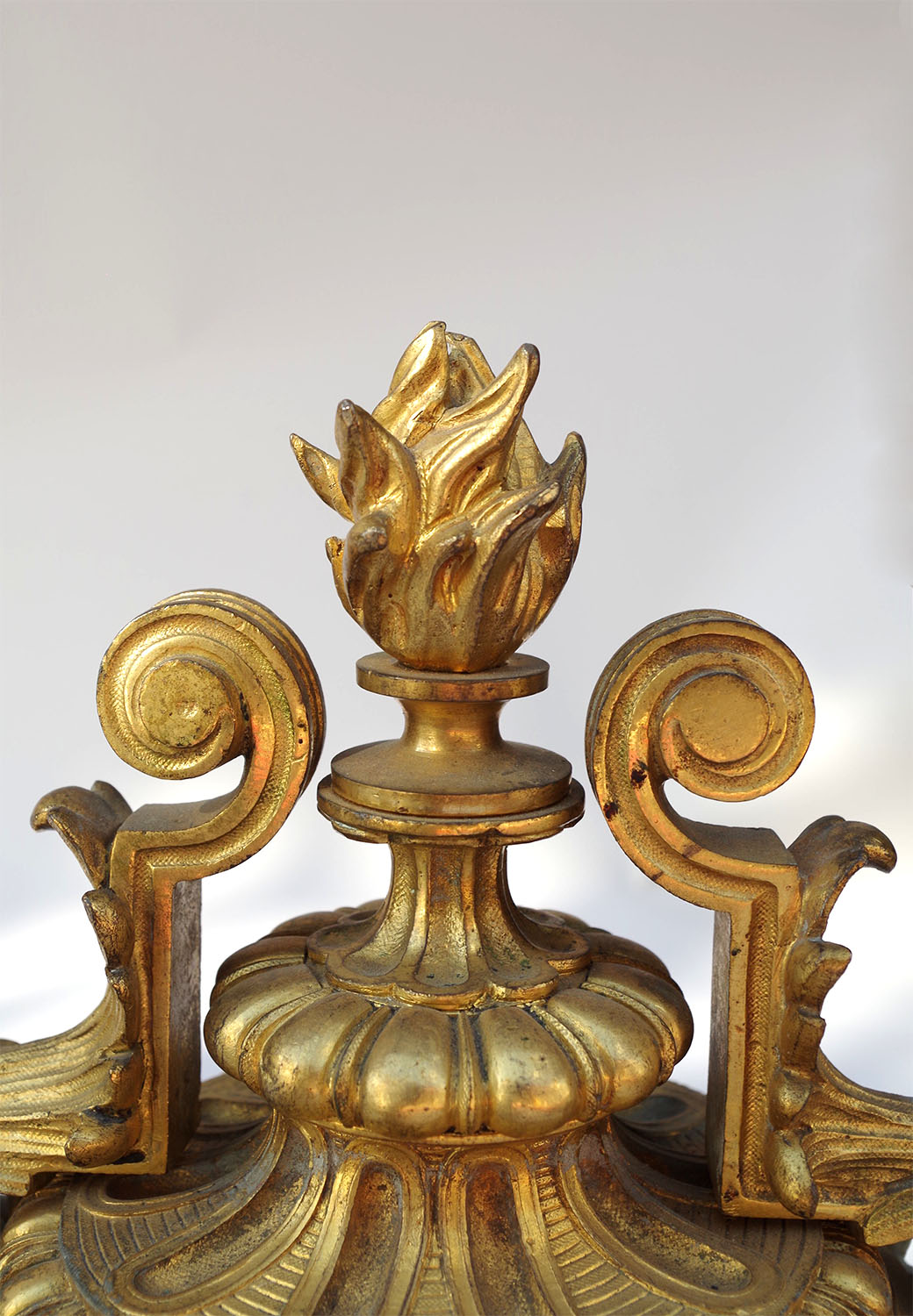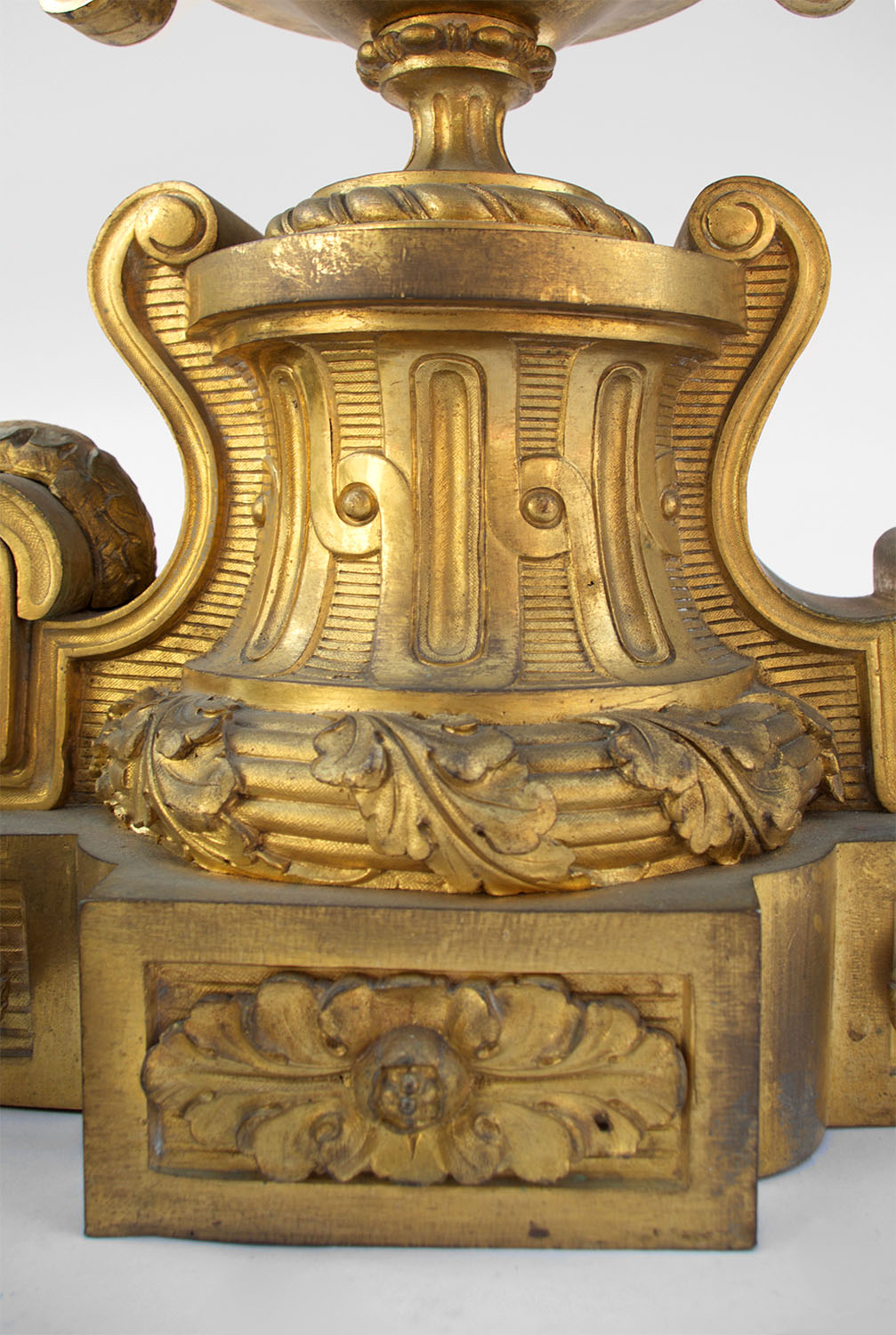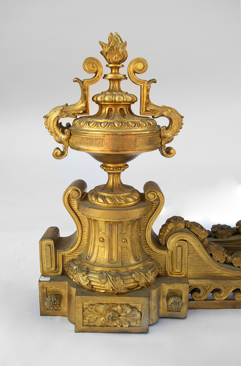 La tête des chenets, en forme de cassolette coiffée d’une torche, est agrémentée des motifs décoratifs typiques du style Louis XVI: baguette de joncs à feuilles de chêne, frise d’oves, godrons, frise de perles…