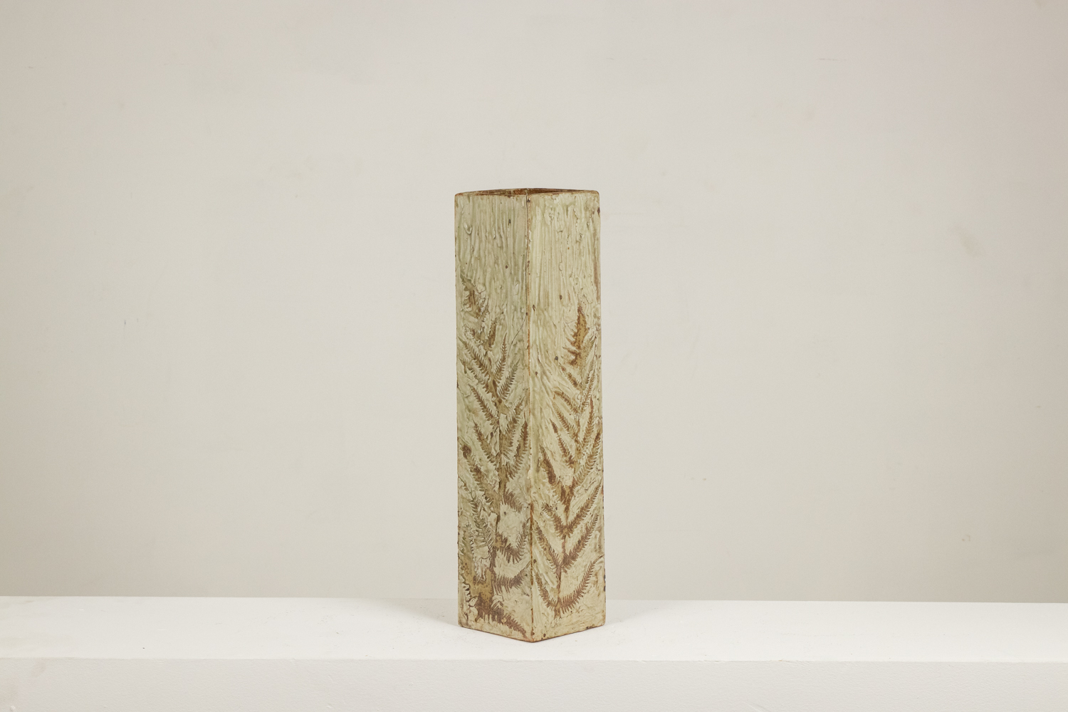 Vase de style Brutaliste en grès scarifié et émaillé et à décor végétal, à section carrée.